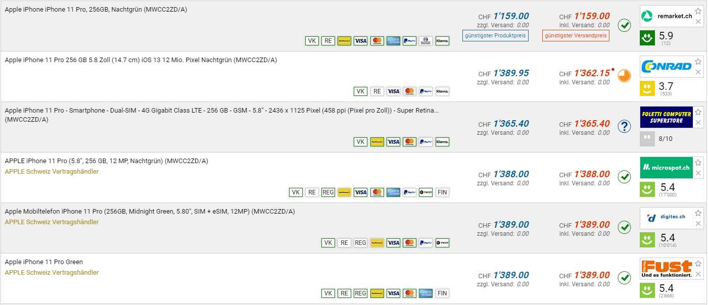 Bei remarket gibt es das APPLE iPhone 11 Pro, 256GB, Nachtgrün für den neuen Bestpreis von CHF 1159.-. Der vorherige Bestpreis war CHF 1236.20. Der zweitbeste Preis beträgt CHF 1362.15.