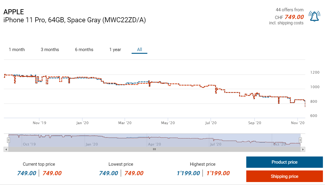 Bei Jelmoli gibts derzeit das letztjährige Top-Smartphone von Apple, dem iPhone 11 Pro in der Farbe Space Grey zum Aktionspreis von 749 Franken, leider nicht kumulierbar mit dem Neukundenrabatt. Dennoch ein guter Preis, wem das iPhone 12 Pro noch zu teuer ist. Soweit ich weiss sollte dies sogar ein neuer Bestpreis sein.