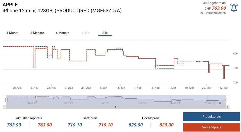 Bei amazon.de gibt es aktuell das APPLE iPhone 12 mini, 128GB, (PRODUCT)RED für 677.89 EUR.