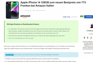 Bei amazon.it gibt’s derzeit das iPhone 14 mit 128GB Speicherplatz zum neuen Bestpreis von 773 Franken! Laut Recherche liegen die Vergleichspreise sonst bei 898 Franken. Schnell zuschlagen! Das Angebot dürfte bald ausverkauft sein.