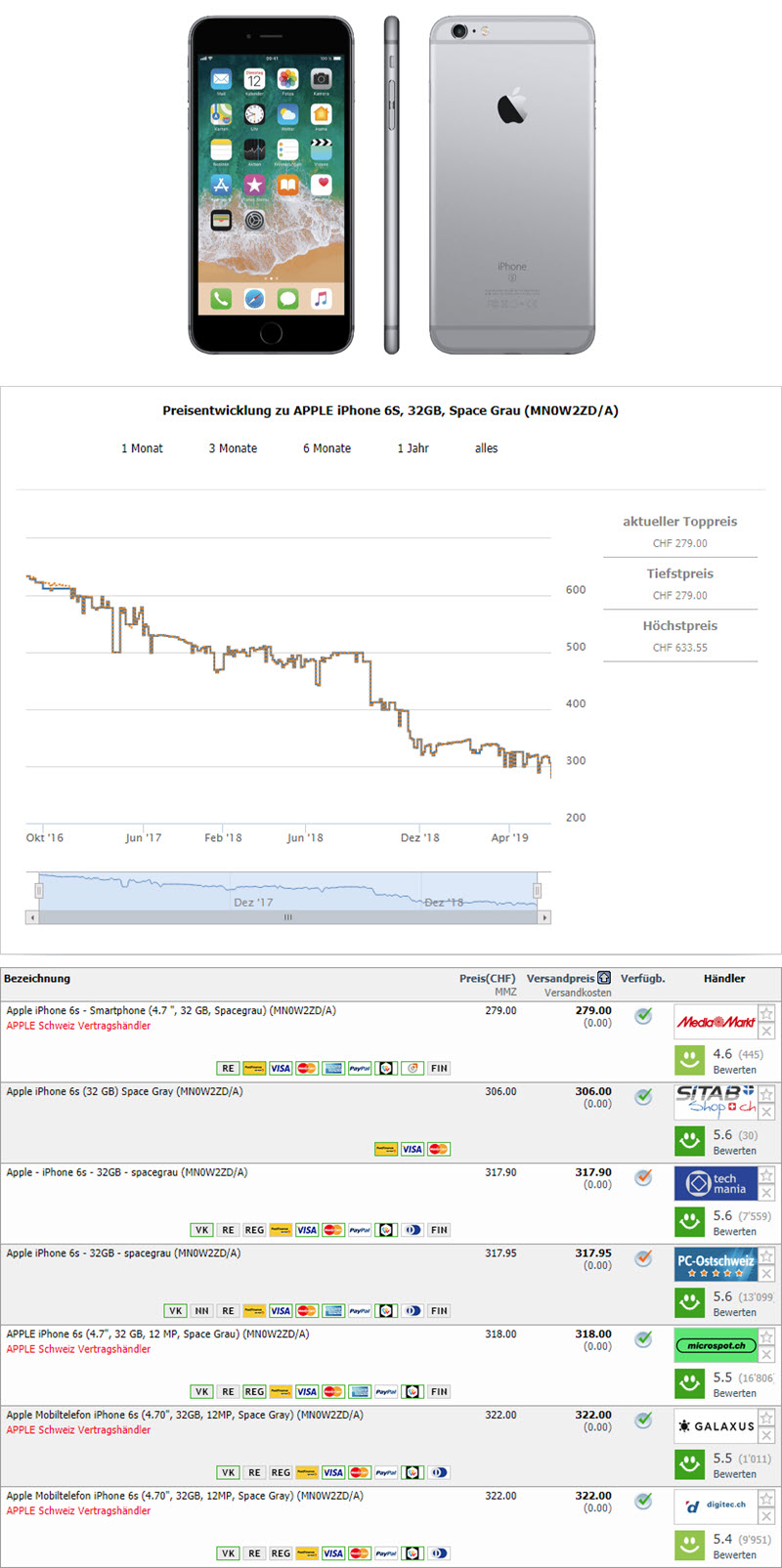 Momentan gibt es bei Media Markt das Apple iPhone 6s Smartphone (4.7″, 32 GB, Spacegrau) zum Bestpreis für CHF 279.-.