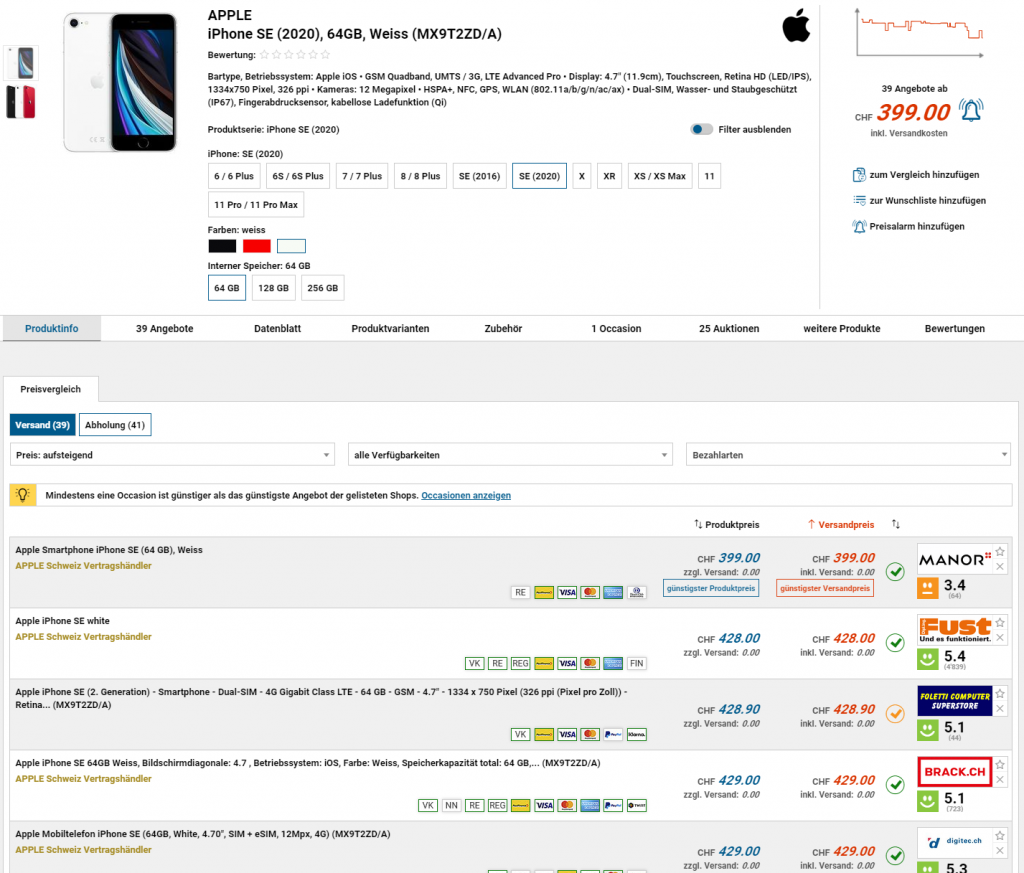 Bei Manor erhält man das aktuelle iPhone SE 2020 für den Bestpreis von CHF 399.- (dieser dürfte wohl erst an Black Friday selber geknackt werden), daher ein super Preis. Das iPhone gibt es in Schwarz, Rot und Silber zu diesem Preis.
