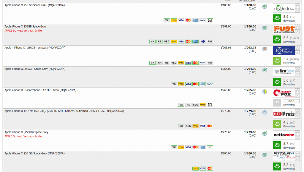 Ha! Wer noch keins hat kann hier zugreifen. 200 CHF Rabatt auf den empfohlenen Verkaufspreis vom iPhone X space grey mit 256 GB bei Fust. Mit dem Promocode „H7RBFH“ gibt’s noch einmal 10.- Rabatt zusätzlich. Somit kommen wir auf den Bestpreis - den besten Preis, den es in der Schweiz bisher fürs iPhone X space grey 256GB gab.