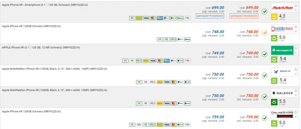 Bei Media Markt gibt es das APPLE iPhone XR mit 128gb für den momentanen Bestpreis von CHF 699.-. Vor wenigen Tagen lag der Preis bereits bei CHF 692.20, jedoch ist das trotzdem ein super Preis. Das zweitbeste Angebot findet man bei MobileDevice mit CHF 748.-.