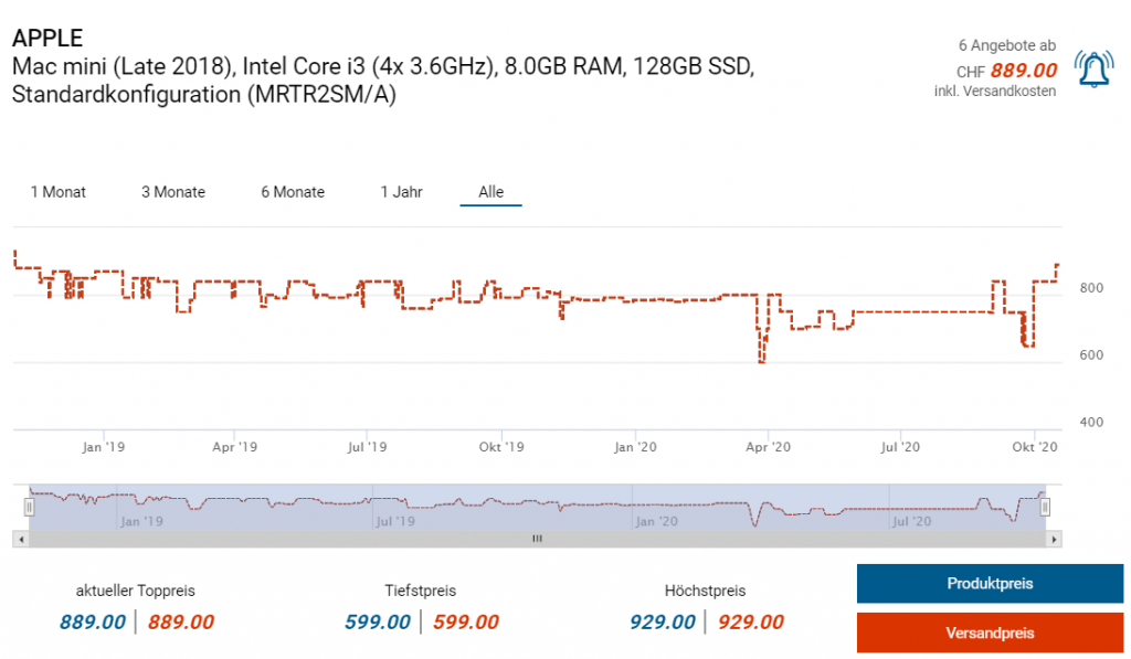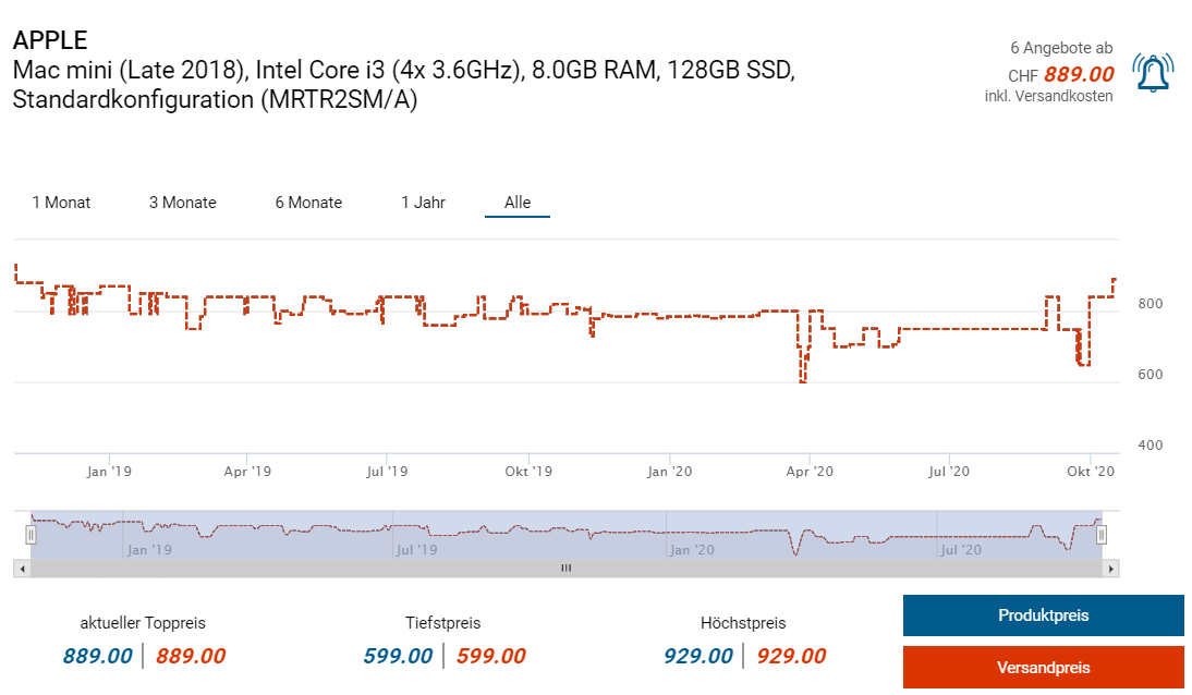 Bei Daydeal gibts derzeit den Mini-PC Mac mini von Apple (Late 2018 Modell) zum Aktionspreis von 599 Franken. Auf der Daydeal-Seite geben sie zwar den (richtigen) Vergleichspreis von 889 Franken an, allerdings gibts das neuere Early 2020 Modell mit 256GB SSD für 786 Franken, weshalb ich diesen als Vergleich heranziehe.