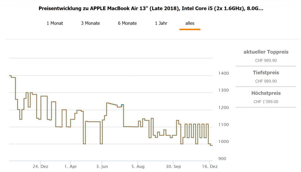Bei Interdiscount gibt’s das MacBook Air wieder einmal zu einem halbwegs vernünftigen Preis von CHF 989.- Zweitbester Preis liegt bei CHF 1399.- Bestpreis war CHF 999.-