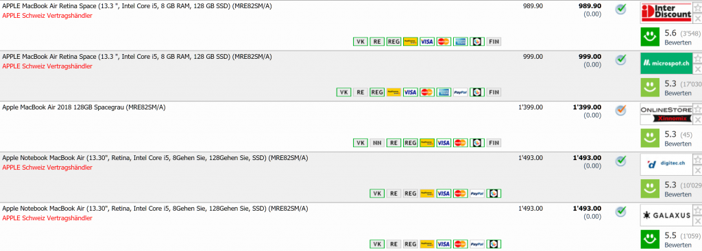 Bei Interdiscount gibt’s das MacBook Air wieder einmal zu einem halbwegs vernünftigen Preis von CHF 989.- Zweitbester Preis liegt bei CHF 1399.- Bestpreis war CHF 999.-