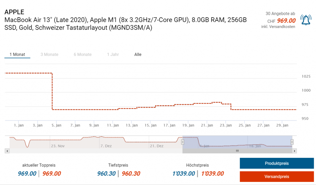 Bei Fust erhält man das Apple MacBook Air 13“ Late 2020 gerade für den guten Kurs von CHF 969.- Mit dem Gutscheincode EMAR21 gibt’s nochmals CHF 10.- Rabatt. Bestpreis war bei CHF 960.30