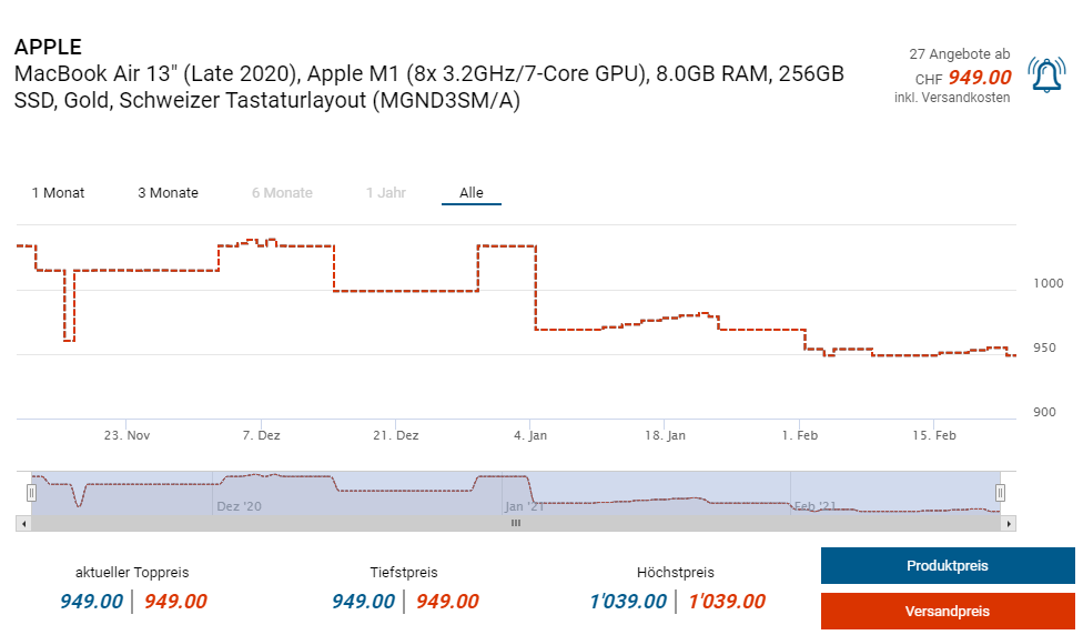 Bei microspot gibts das MacBook Air mit 8GB RAM und 256GB SSD wieder einmal zum günstigeren Preis von 939 Franken (nach Abzug des 10 Franken Bons). Da digitec und Fust als nächstgünstigere Anbieter erst mit spätem Liefertermin rechnen, gebe ich beim Vergleichspreis denjenigen vom nächstschnelleren Händler an (foletti Computer Superstore).