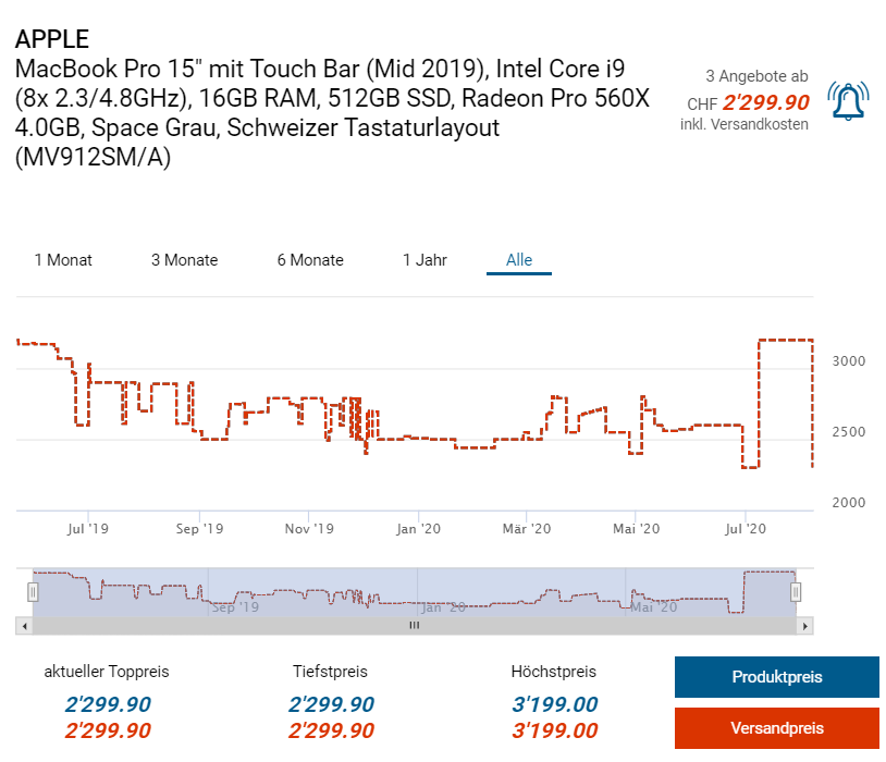 Bei Interdiscount gibts derzeit das Highend-Notebook Macbook Pro von Apple aus der Mid 2019-Serie mit i9-Prozessor, 16GB RAM, 512GB SSD und der Grafikkarte AMD Radeon Pro 560X mit 4GB GDDR5-Speicher zum Aktionspreis von knapp 2300 Franken. Laut toppreise gabs den Preis schon mal vor etwa einem Monat.