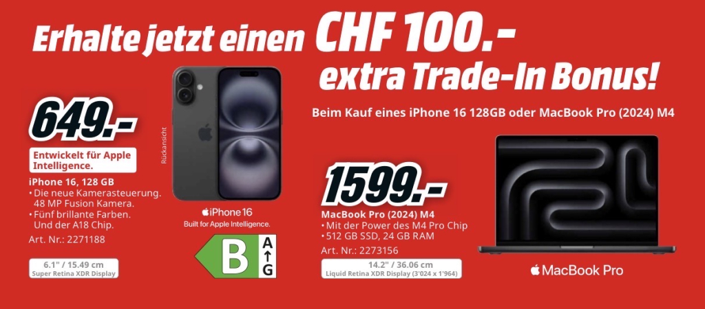 Aktuell gibts bei MM das Macbook Pro mit M4 Pro, 24 GB RAM und 512 GB SSD für CHF 1599.-. Wenn noch ein “alter Toaster” als Trade-In-Gerät hergegeben wird, gibts noch CHF 100.- Bonus oben drauf. So sollten eigentlich CHF 1499.- Endpreis möglich sein.