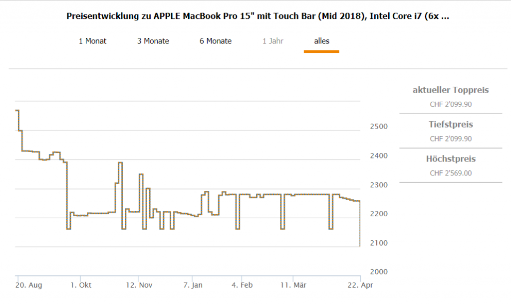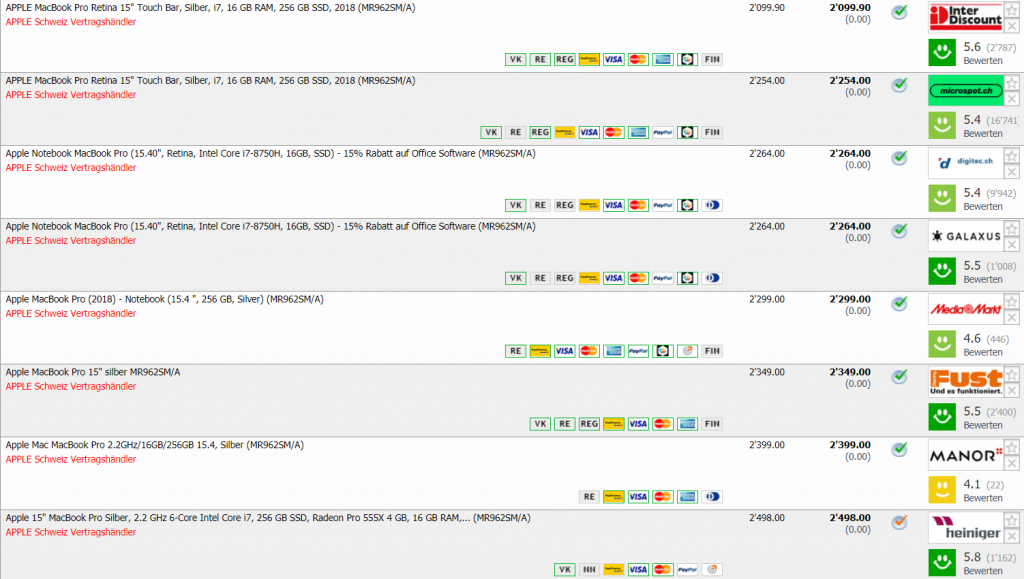 Bei Interdiscount gibt’s gerade das APPLE MacBook Pro Retina 15″ Touch Bar, Silber, i7, 16 GB RAM, 256 GB SSD, 2018 für CHF 2099.90 Zweitbester Preis im Moment: CHF 2’254.- Bestpreis bisher: CHF 2’159.90