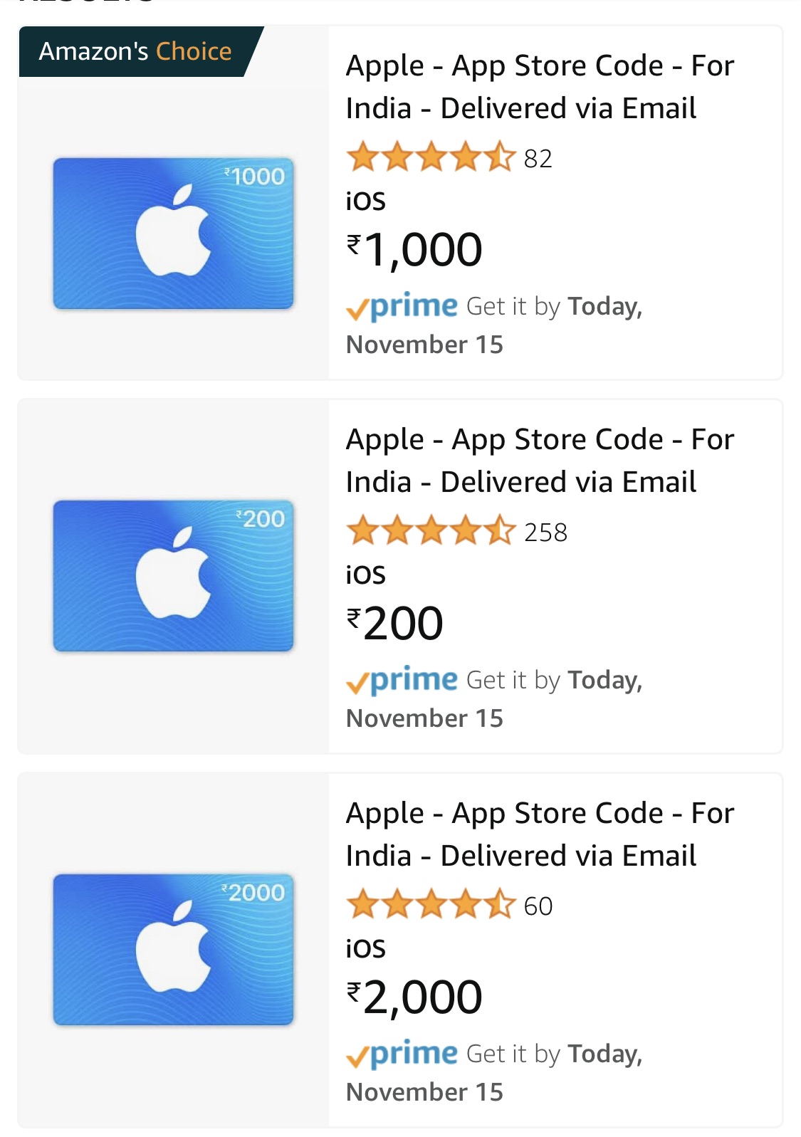 - Sucht danach auf Amazon Indien nach „Apple Store Gift Card“. Das müsste dann so aussehen: