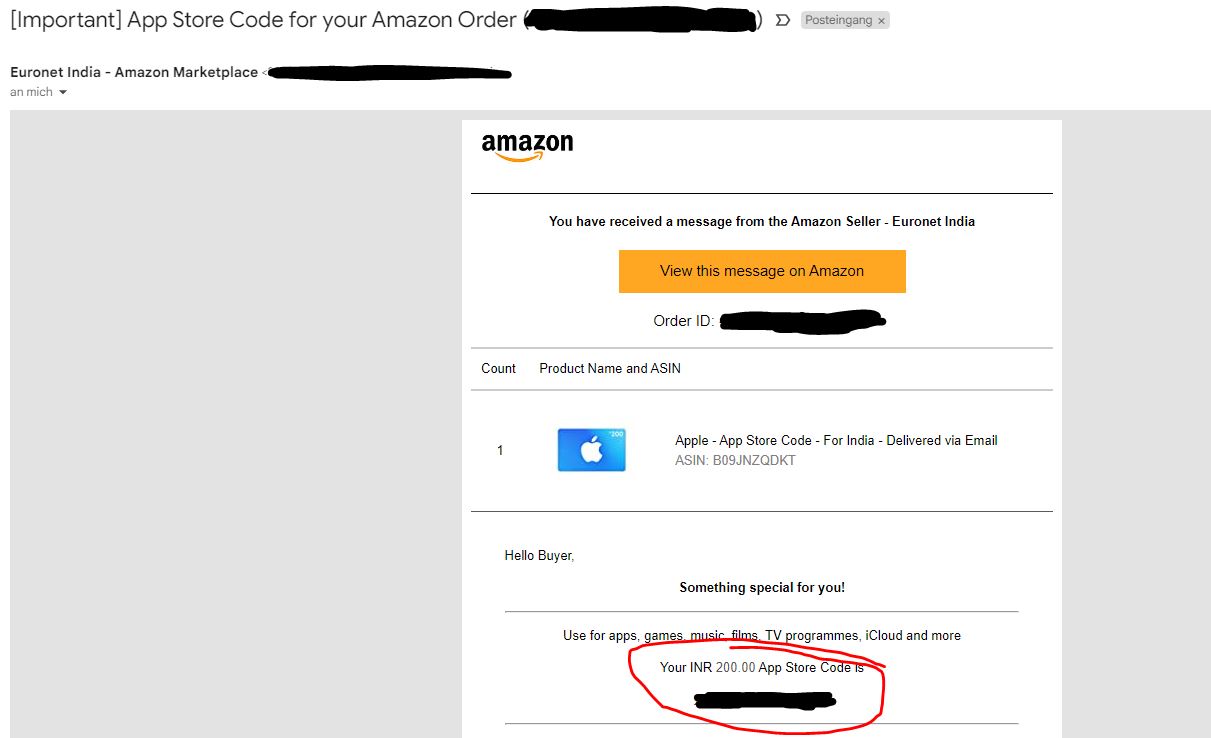 Mein Amazon.de Konto hat beim Kauf des Apple gift cards in Indien ein Hackeralarm ausgelöst, und es war kurzeitig gesperrt. Ich habe dann zum Kauf der Apple gift cards ein Amazon.in gemacht. Dann hat es funktioniert.