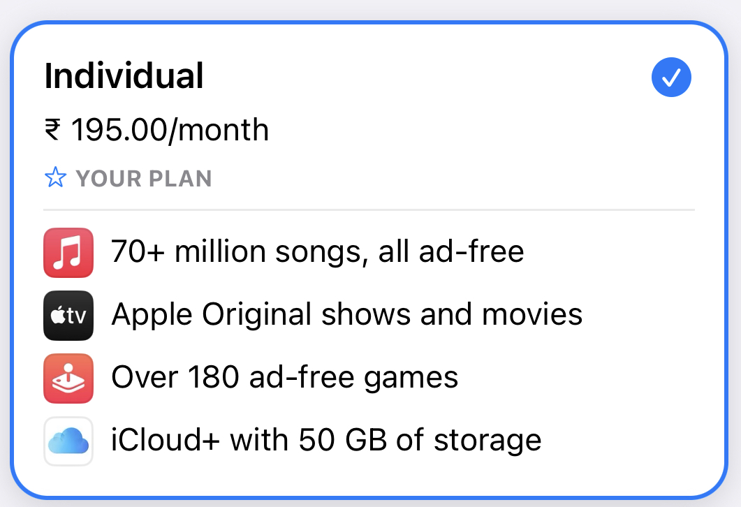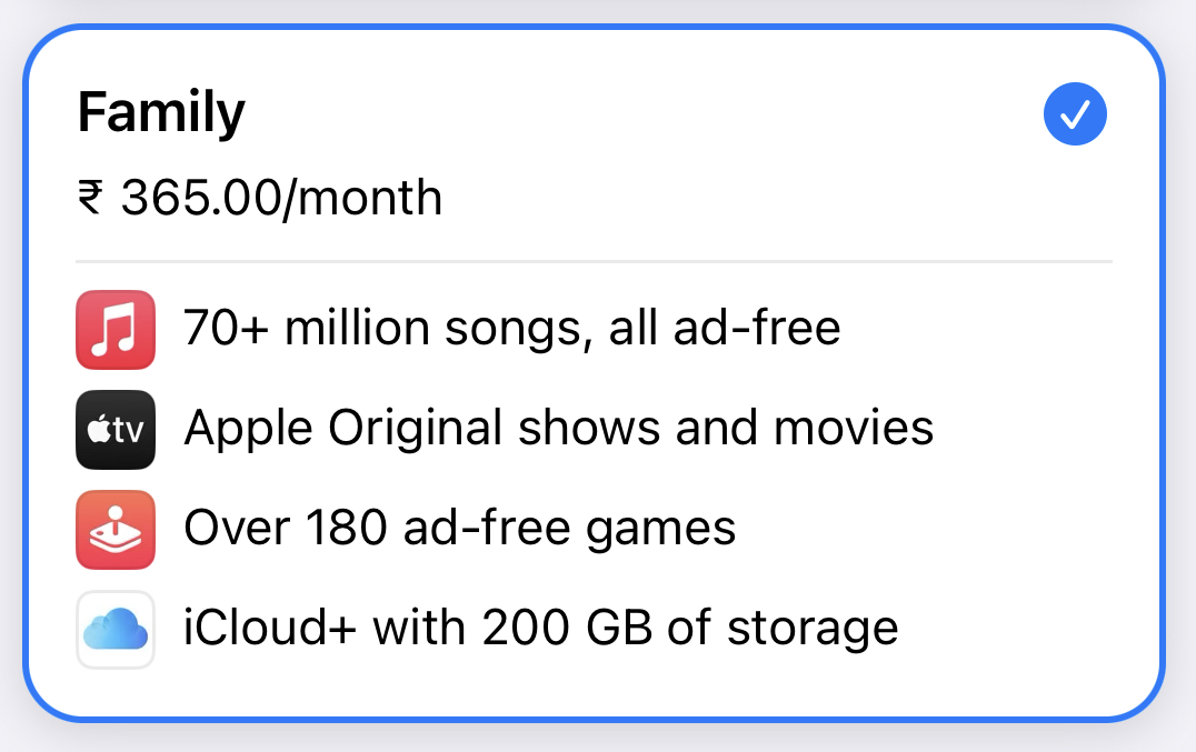 Mit einer indischen Apple ID könnte ihr das Apple One Paket (normal oder Family) für CHF 2.25 (195 Rupien) statt CHF 20.90 pro Monat resp. Family für CHF 4.25 (365 Rupien) statt CHF 28.90 lösen.