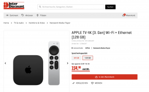 Interdiscount bietet seit heute den neuen Apple TV 4K (3. Gen) Wi-Fi + Ethernet (128 GB) zum reduzierten Preis an.