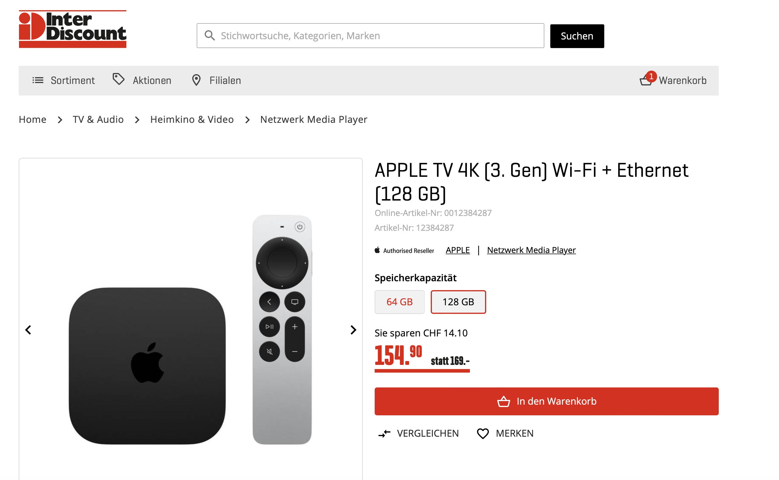 Im Moment sind personalisierte CHF 10.- Rabatt Gutscheine im Umlauf. Dann kriegt man den Apple TV nochmals ein paar Fränkli günstiger ;-)