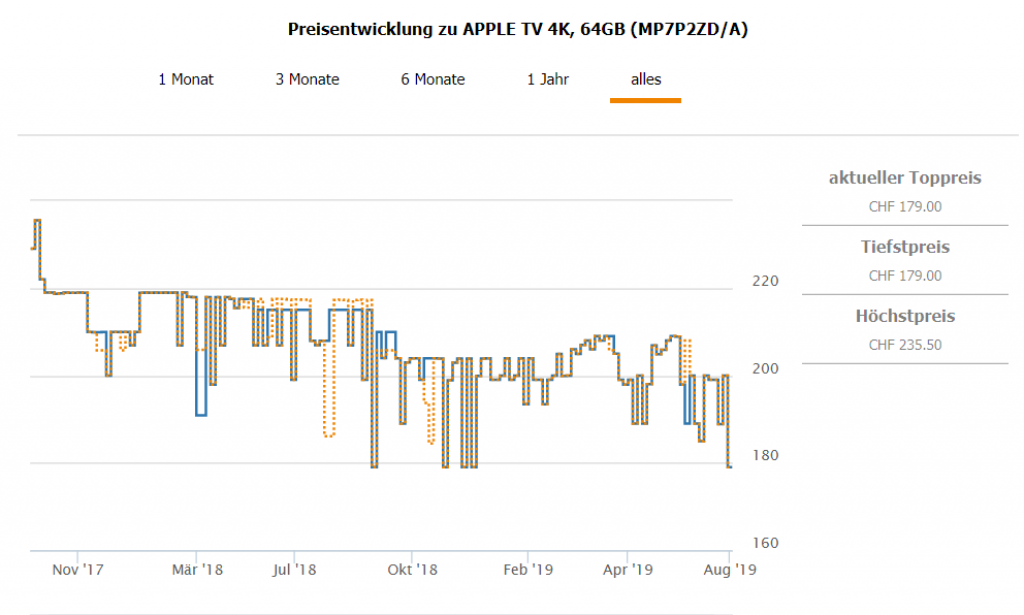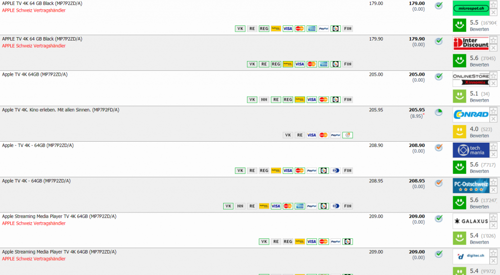 Bei microspot gibt’s heute den Apple TV 4K 64GB für CHF 179.- Zweitbester Preis bietet Interdiscount mit CHF 179.90, richtiger zweitbester Preis liegt bei CHF 205.- Bestpreis war bei CHF 179.-