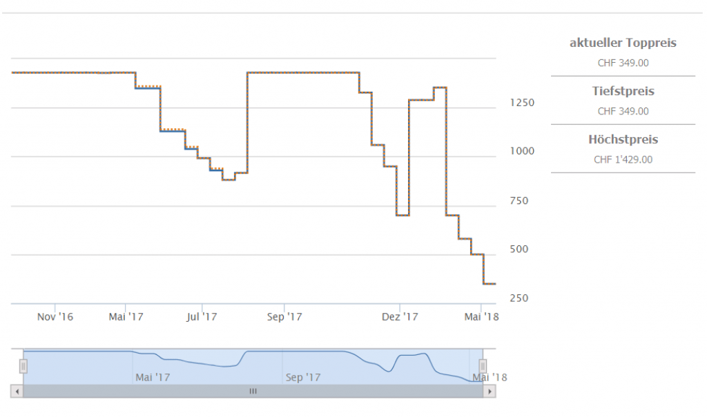 Schaut man sich den Preisverlauf an, sieht man schon, dass es ein super Preis ist. Bis Mitte Mai diesen Jahres gab’s diese Apple Watch nie für unter CHF 499.-