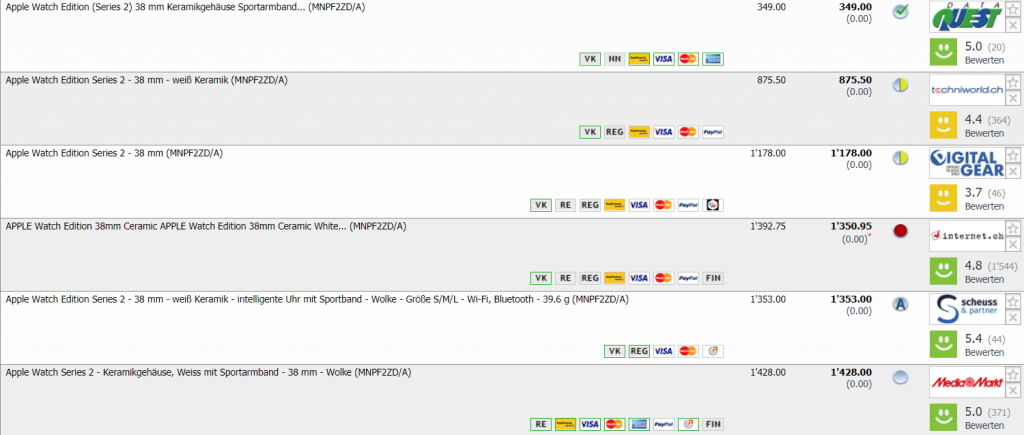 Die Vorjahresedition der Apple Watch 38mm – aktuell ist die Series 3 – gibt’s bei Dataquest mit einem schönen weissen Keramikarmband für den tollen Preis von CHF 349.- Den Preisvergleich kann man bei bereits etwas älteren Modellen nicht mehr wirklich aussagekräftig machen, da nur noch kleine Shops die gleiche Apple Watch im Sortiment führen. Deswegen habe ich als Vergleichspreis den vorherigen Bestpreis genommen.