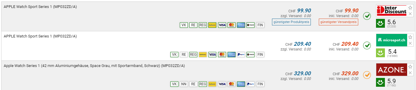 Bei Interdiscount gibt es die APPLE Watch Series 1 für den neuen Bestpreis von CHF 99.90. Der vorherige Bestpreis war CHF 189.-. Der zweitbeste Preis beträgt CHF 209.40.
