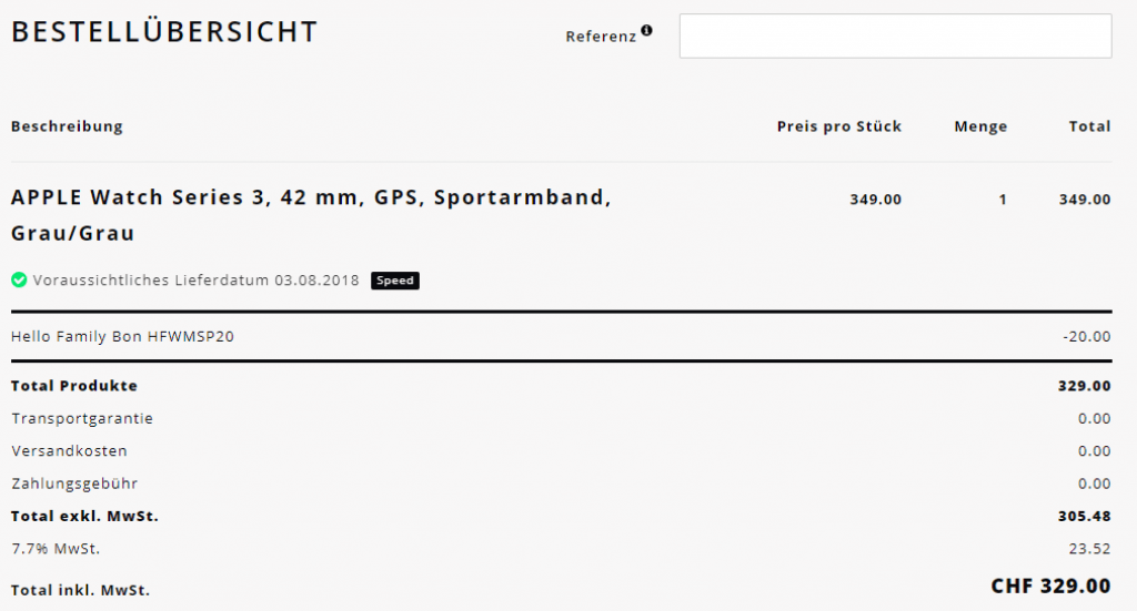 Normal kostet die Smartwatch CHF 349.-. Mit dem Hellofamily Gutschein „HFWMSP20“ gibts nochmals 20.- Rabatt.