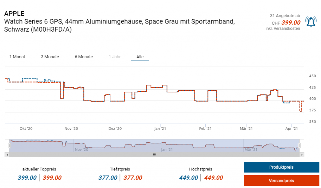 Bei Fust gibts derzeit die Apple Watch Series 6 in der 44mm-Ausführung in der Farbe Space Gray zum Preis von 399 Franken. Wenn ihr euch bei blackfridaydeals zum Newsletter anmeldet, könnt ihr zudem einen 20 Franken Gutschein für Fust auswählen und den Preis so auf CHF 379.- drücken. Laut toppreise liegt der Vergleichspreis bei diesem Modell bei 419 Franken.
