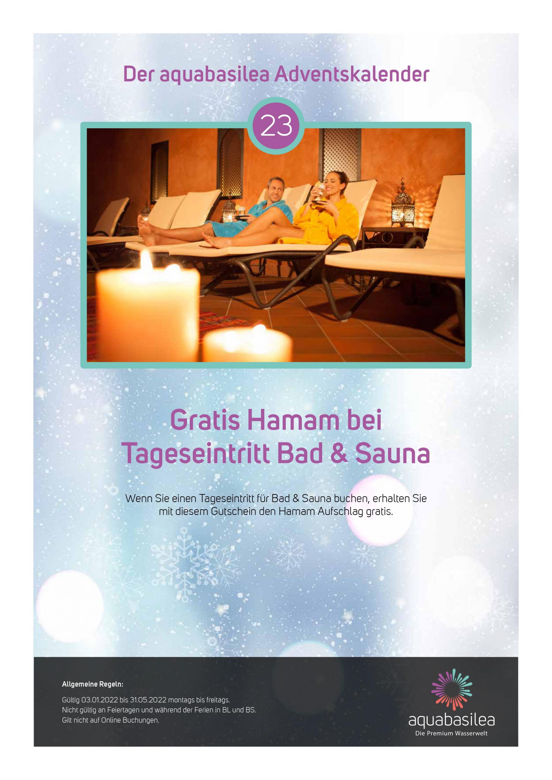 Gültig 03.01.2022 bis 31.05.2022 montags bis freitags. Nicht gültig an Feiertagen und während der Ferien in BL und BS. Gilt nicht auf Online Buchungen.