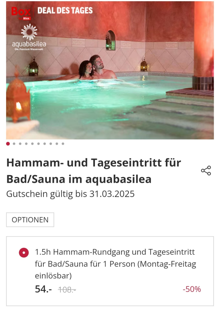 - Hammam Premium 1,5 Stunden und Tageseintritt Bad für Fr. 54.- pro Person.