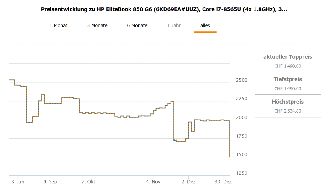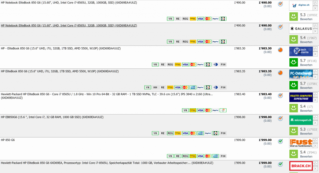 Bei digitec gibt’s das sehr gut ausgestattete Notebook HP EliteBook 850 G6 mit UHD Display, i7 Prozessor, 32GB RAM und 1000GB SSD Festplatte für CHF 1490.- Zweitbester Preis liegt bei CHF 1983.- Bestpreis bisher war bei CHF 1704.-