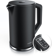 Habe dieses Wasserkocher zuhause und bin sehr zufrieden damit. Er heizt Wasser ziemlich schnell auf und mit Temperaturregelung kann man gut diverse Grünteesorten unkompliziert optimal zubereiten. Aussen ist das Gehäuse mit einer Plastikschicht überzogen als Verbrennungsschutz. Wie im Dealtext steht, braucht ihr zusätzlich den Schuko-Adapter, was etwas Platz an der Steckdose frisst :)