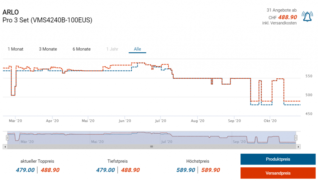 Bei Amazon gibts derzeit das Überwachungssystem Arlo 3 Pro mit 2 Kameras zum Aktionspreis von knapp 418 Franken, laut toppreise liegt der Vergleichspreis für die schwarze Variante bei CHF 488.90, die weisse gäbe es schon ab 479 Franken.
