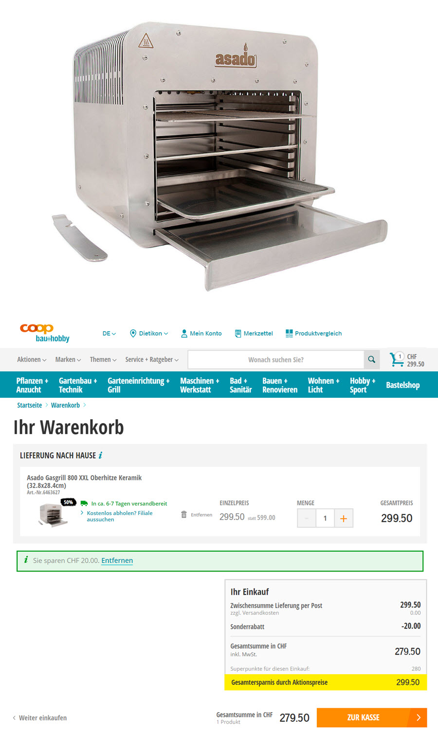 Aktuell gibt es bei Coop Bau + Hobby den Asado Oberhitze Gasgrill 800 XXL zum Bestpreis von CHF 279.50 wenn man beim Checkout den Gutscheincode BM27-DG7C4 verwendet (zweitbester Preis ist momentan CHF 568.- bei Galaxus).