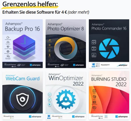 Die Welt schaut mit Sorgen auf den Krieg in der Ukraine, der Not und Vertreibung für unzählige Menschen bedeutet. Ashampoo will den Leidtragenden des Kriegs helfen und bieten Ihnen dafür ein Paket, dass es noch nie so gegeben hat! Zahlen Sie 4 € (oder mehr) für Software im Gesamtwert von 169,96 €!