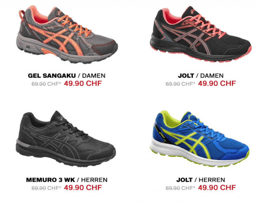 Bei Dosenbach gibt’s gerade vier Asics-Runningschuhe für nur gerade CHF 49.90. Ideal, jetzt wo es wärmer wird und die Running-Saison losgeht!