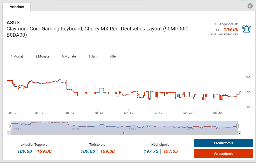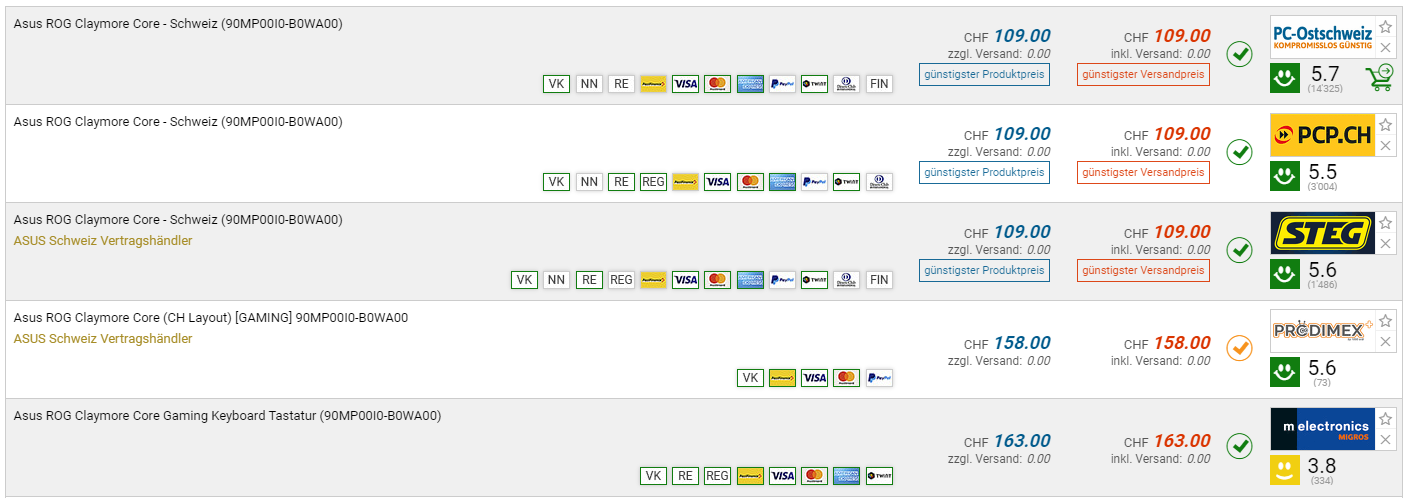 Bei Steg und den Partnerseiten PCP/PC-Ostschweiz gibt es momentan das ASUS Claymore Core Gaming Keyboard mit DE Layout zum Bestpreis von CHF 109.-. Der vorherige Bestpreis war CHF 129.-. Der zweitbeste Preis beträgt CHF 158.-.