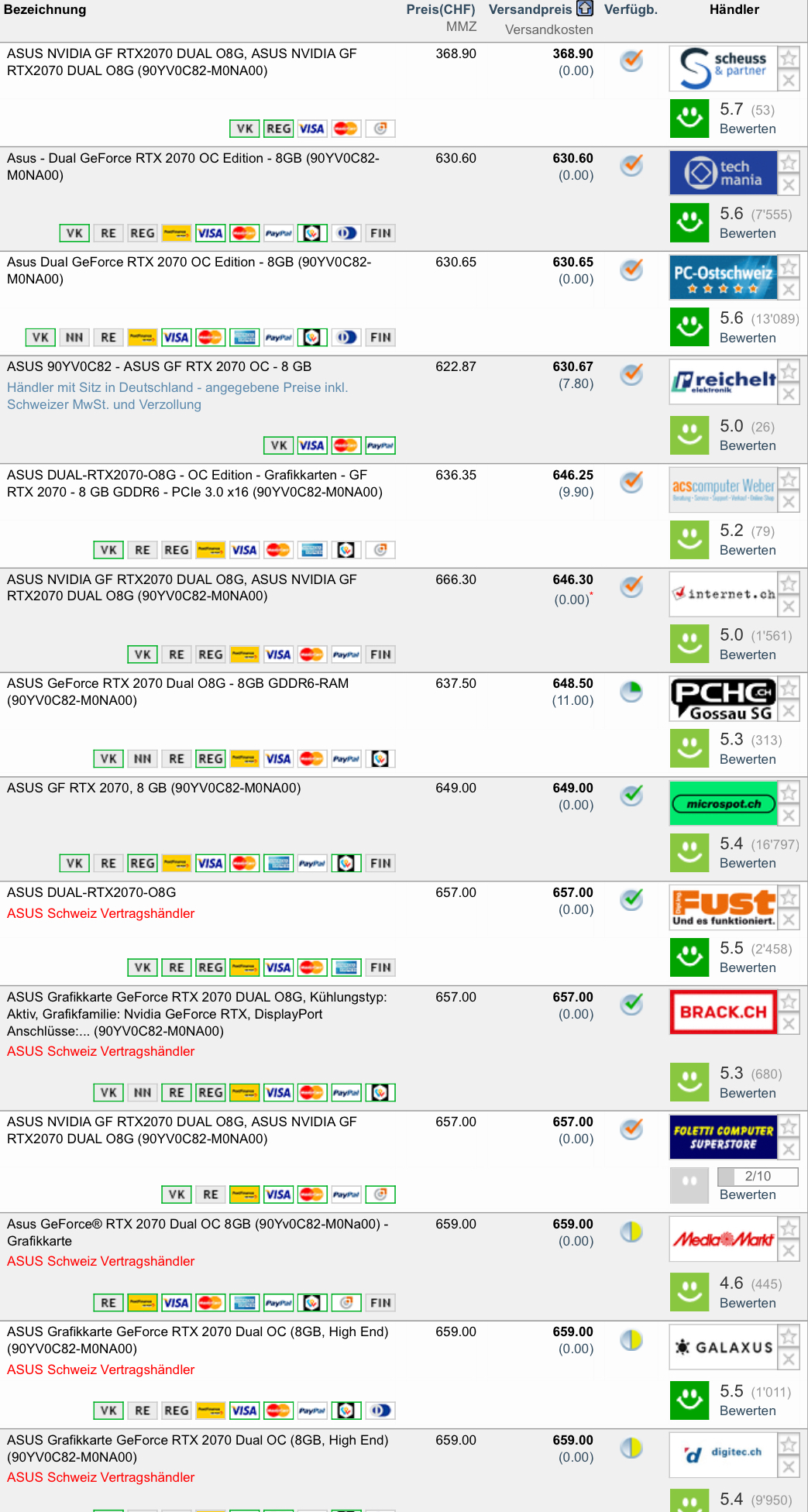 Die Grafikkarte ist sogleich auch auf ACSComputer erschienen. Für einen Preis von 362.55CHF, jedoch ist keine Abholung möglich. Link dazu: Auf der Homepage einfach nach "ASUS DUAL-RTX2070-O8G" suchen (https://www.acscomputer.ch/)