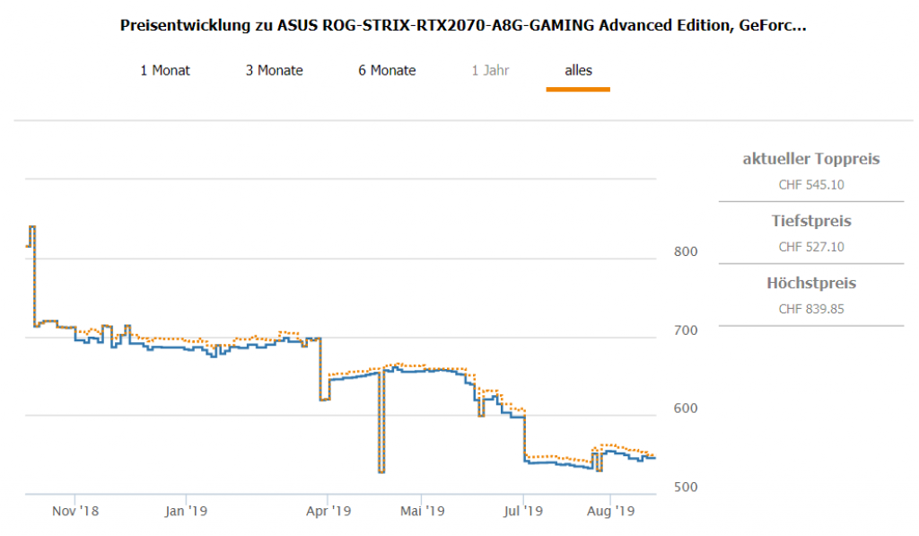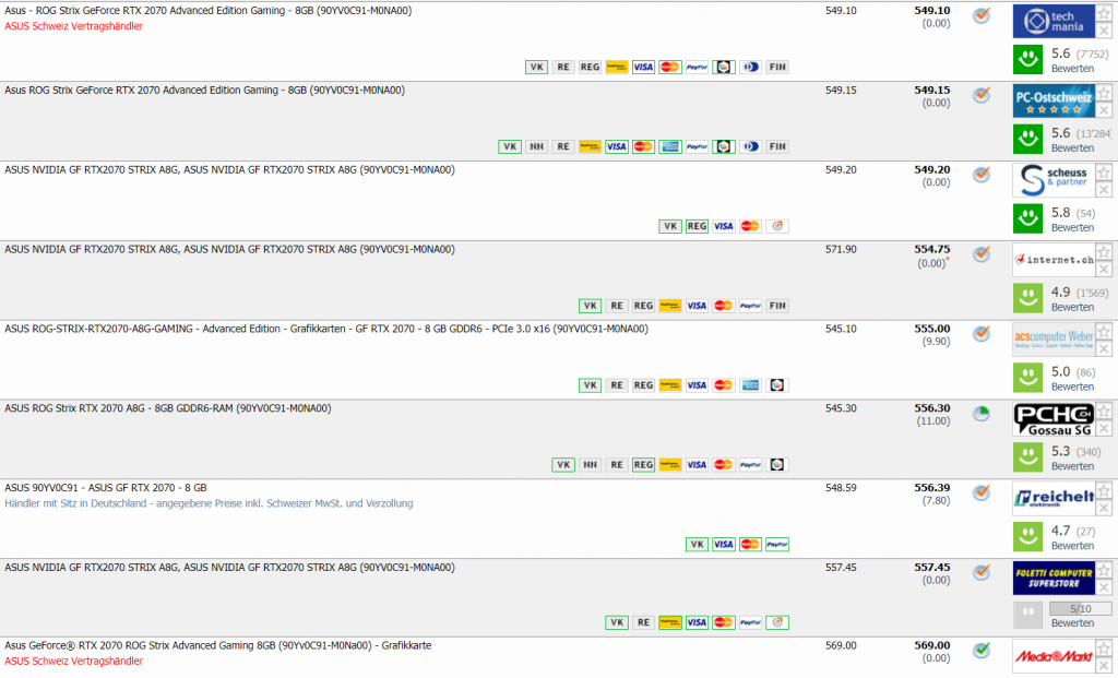 Bei digitec gibt’s die ASUS GeForce ROG Strix RTX 2070 A8G (8GB, High End) gerade für CHF 469.- Zweitbester Preis laut toppreise ist bei CHF 549.10, Bestpreis bei CHF 527.10
