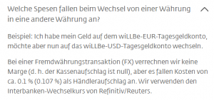wiLLBe: Wechsel am nächsten Bankwerktag, man weiss den Kurs erst im Nachgang, Aufschlag ca 0.1%, keine Limite.