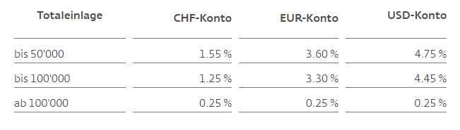 - Attraktive Zinssätze auf CHF (1.55%), EUR (3.60%) und USD (4.75%) bei voller Flexibilität, das Geld steht immer zur freien Verfügung und kann täglich überwiesen werden.
