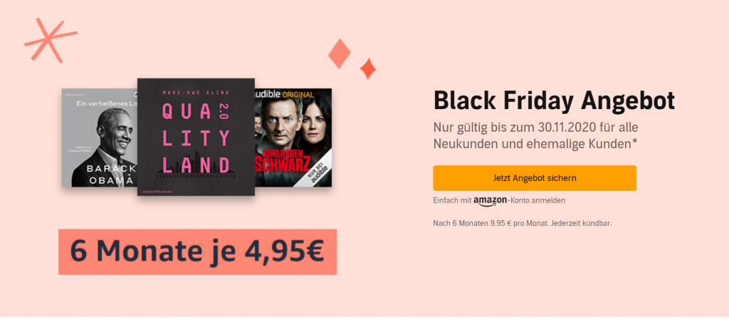 Bei Audible ist jetzt schon Black Friday. Es gibt 50% Rabatt auf die ersten 6 Monate d.h. jeden Monat bezahlt man also 4.95 EUR und erhält damit ein Hörspiel bzw. Hörbuch nach Wahl.