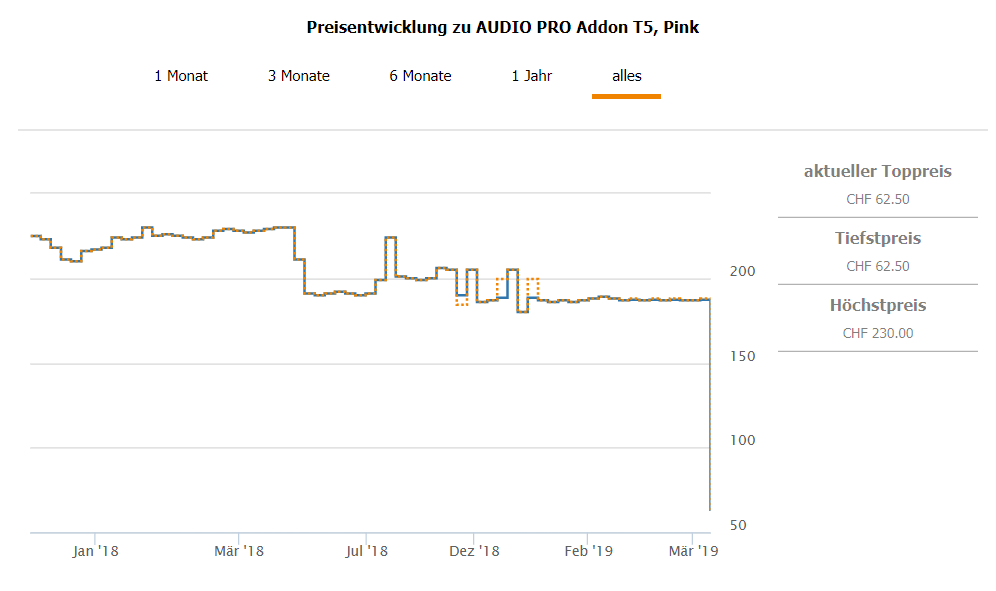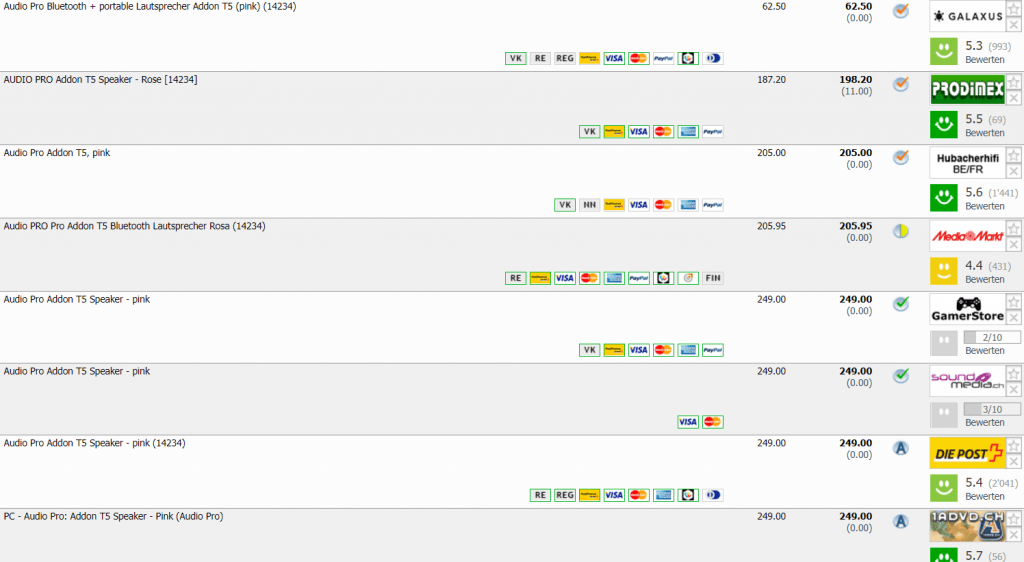 Bei Galaxus erhält man gerade den Bluetooth Lautsprecher Audio Pro Addon T5 (pink) für CHF 62.50 Zweitbester Preis beträgt CHF 198.20, Bestpreis war bei 180 Franken.