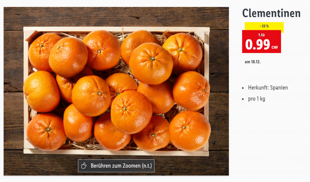 Bei Lidl gibt es auch noch Clementinen für nur CHF 0.99.- pro Kilogram. Als Vergleich gibt’s bei Coop Clementinen für CHF 1.98.- pro Kilogram. Bei Lidl kauft man also 2 Kg für den Preis von 1 Kilogram im Vergleich zur Konkurrenz.