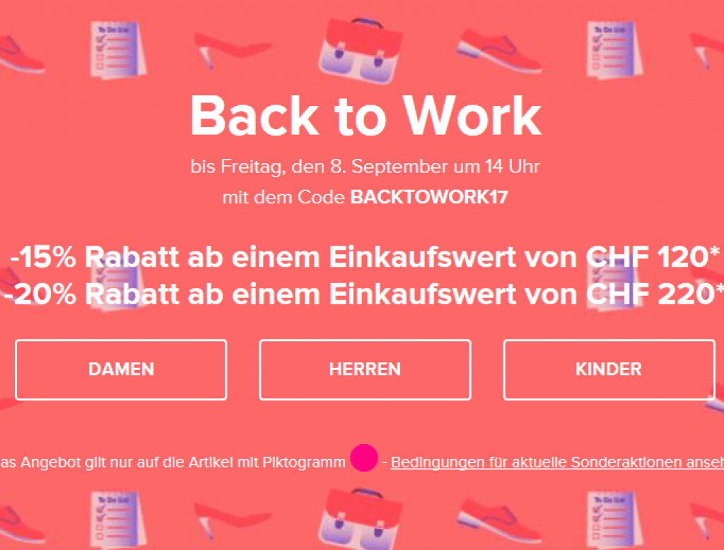 Sarenza möchte dir das Ende des Sommers versüssen! Daher gibt es dort eine „Back to Work“-Aktion. Bis einschliesslich Freitag, den 8. September, kannst du dort von einem Rabatt von bis zu 20% profitieren, wenn du einen oder mehrere Artikel aus der Auswahl für diese Aktion kaufst. Die ausgewählten Artikel sind mit einem pinken Punkt gekennzeichnet. Auf der Angebotsseite findest du sie alle auf einen Blick. Um zu profitieren, musst du den Code „BACKTOWORK17“ angeben.