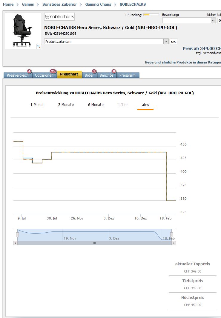 Digitec / Galaxus räumt ihr Gaming Lager auf. Die Angebote reichen von Spielkonsolen (XBOX One, Nintendo Switch, Sony Playstation) sowie entsprechende Games, VR Brillen, Controller sowie Gamingstühle der Marke noblechairs. Die Stühle EPIC und ICON wurden in der Vergangenheit bereits mit Rabatt verkauft. Der Gaming Stuhl HERO (seit Sommer 2018 auf dem Markt) wird nun zum Tiefstpreis verkauft! Stückzahl ist bei der Aktion begrenzt. Aktion läuft bis 06.03.2019.