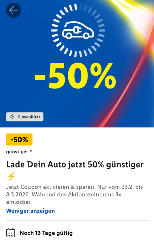 Die Aktion gilt für’s Laden an den LIDL-Ladesäulen via LIDL-App.