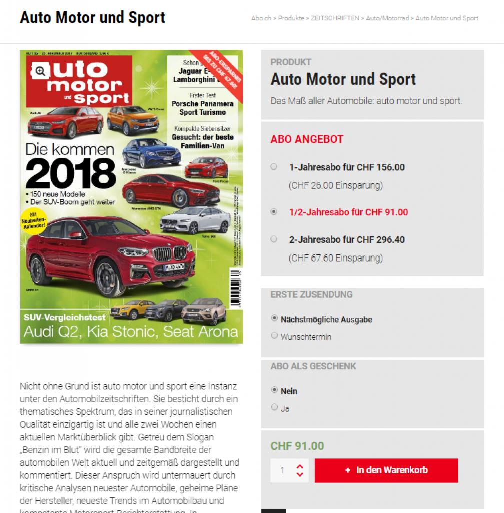 Momentan bekommt man bei Abo-Direkt die Zeitschrift Auto Motor und Sport für 6 Monate für CHF 60.-, zusätzlich gibt’s CHF 7.50 Rabatt mit dem Gutscheincode shopping-freude-ch. In 6 Monate erhält man 13 Zeitschriften, die sogar kostenlos geliefert werden.