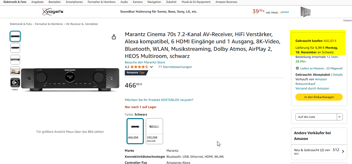 Wer einen 8K-fähigen Receiver will und ein kleines, hübsches Gerät möchte, hat nicht viel Auswahl. Der Marantz Cinema 70s erfüllt die Technologie-Checkliste (8K@60Hz mit HDCP 2.3, Dolby Atmos, DTS:X, AirPlay 2) und gefällt zumindest mir ausgesprochen gut.