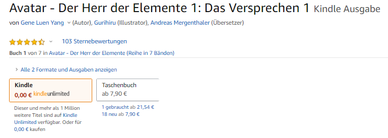 Momentan ist der Comic Avatar – Der Herr der Elemente gratis Comic im Kindle Store erhältlich. Normalerweise kostet er ca. CHF 2.99. Das Angebot gilt nur für Kindle Unlimited Kunden. Neukunden können Kindle Unlimited mit diesem Link gratis zwei Monate lang testen. Hier klicken.