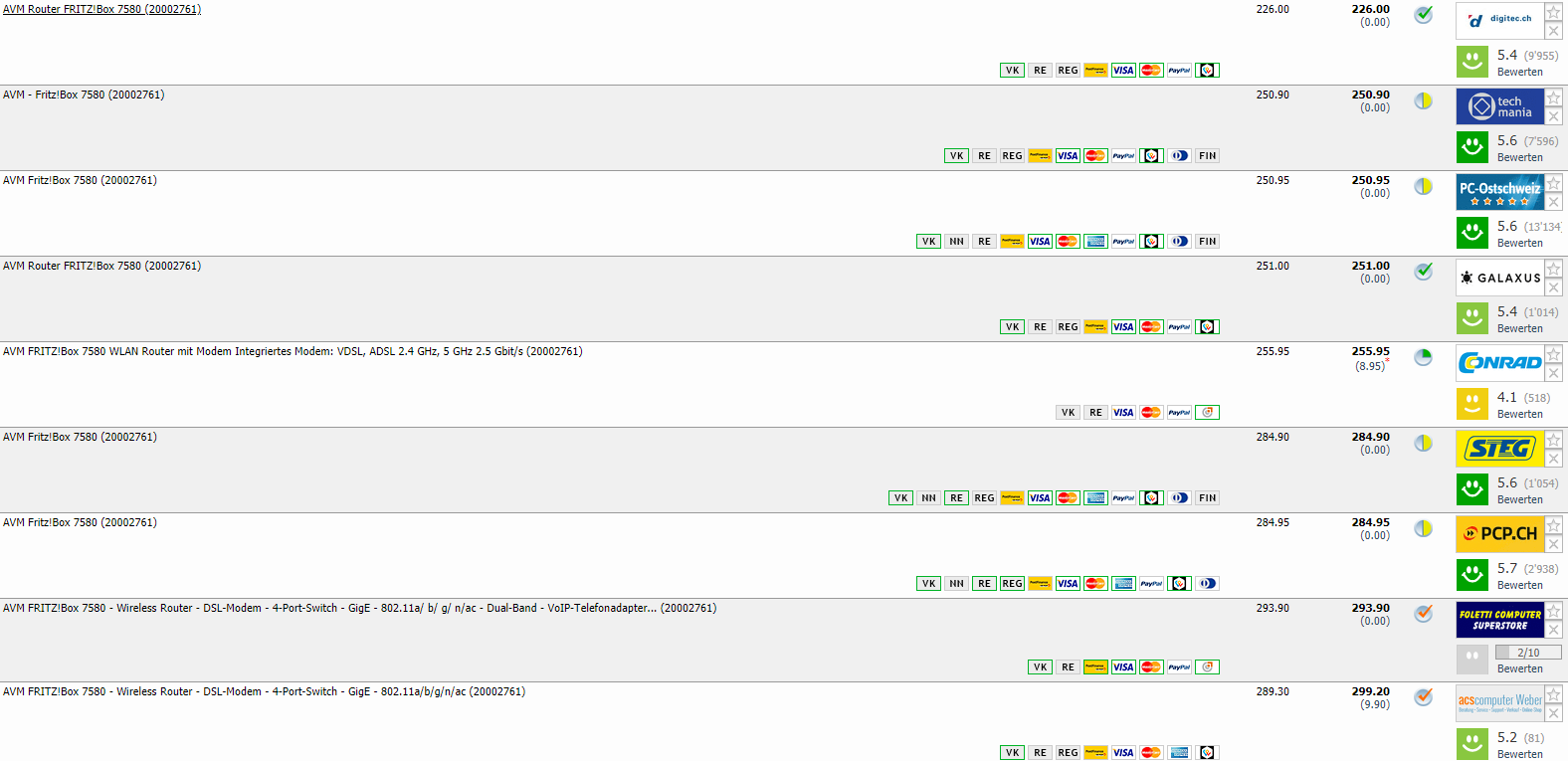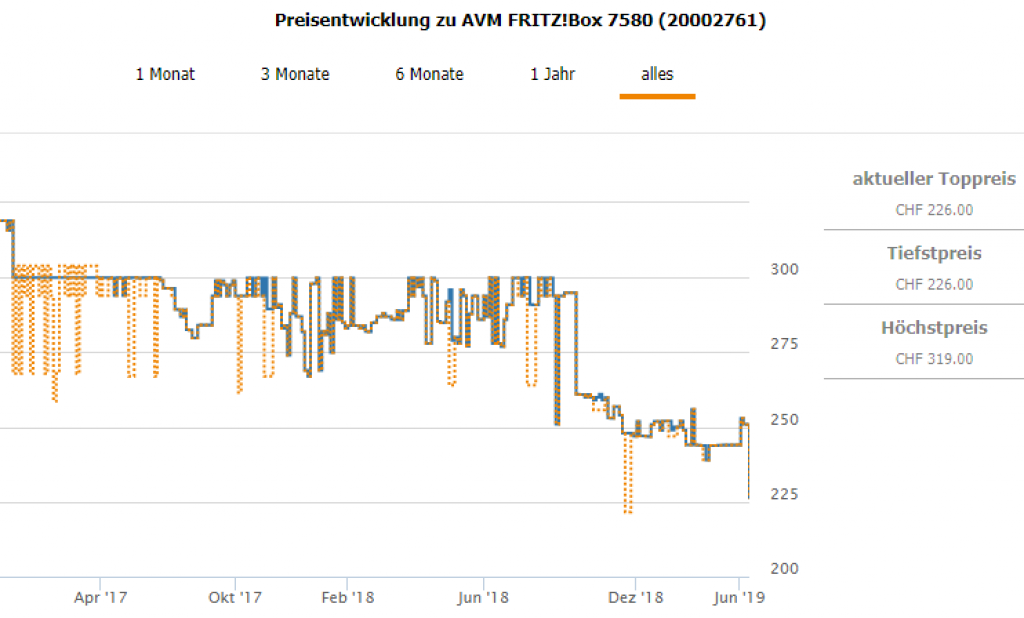 digitec bietet aktuell den AVM Fritz!Box 7580 WLAN-Router für CHF 226.-. Laut toppreise.ch ist das ein neuer Tiefstpreis. Der Vergleichspreis liegt bei CHF 250.90.